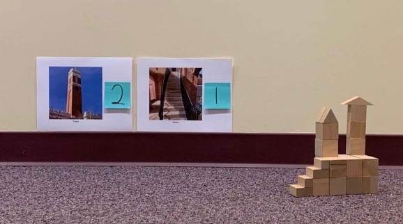 2. Look at the pictures of buildings and tell children what items and how many of each item to include in their buildings (e.g., 4 walls, 2 doors, and 1 ramp).